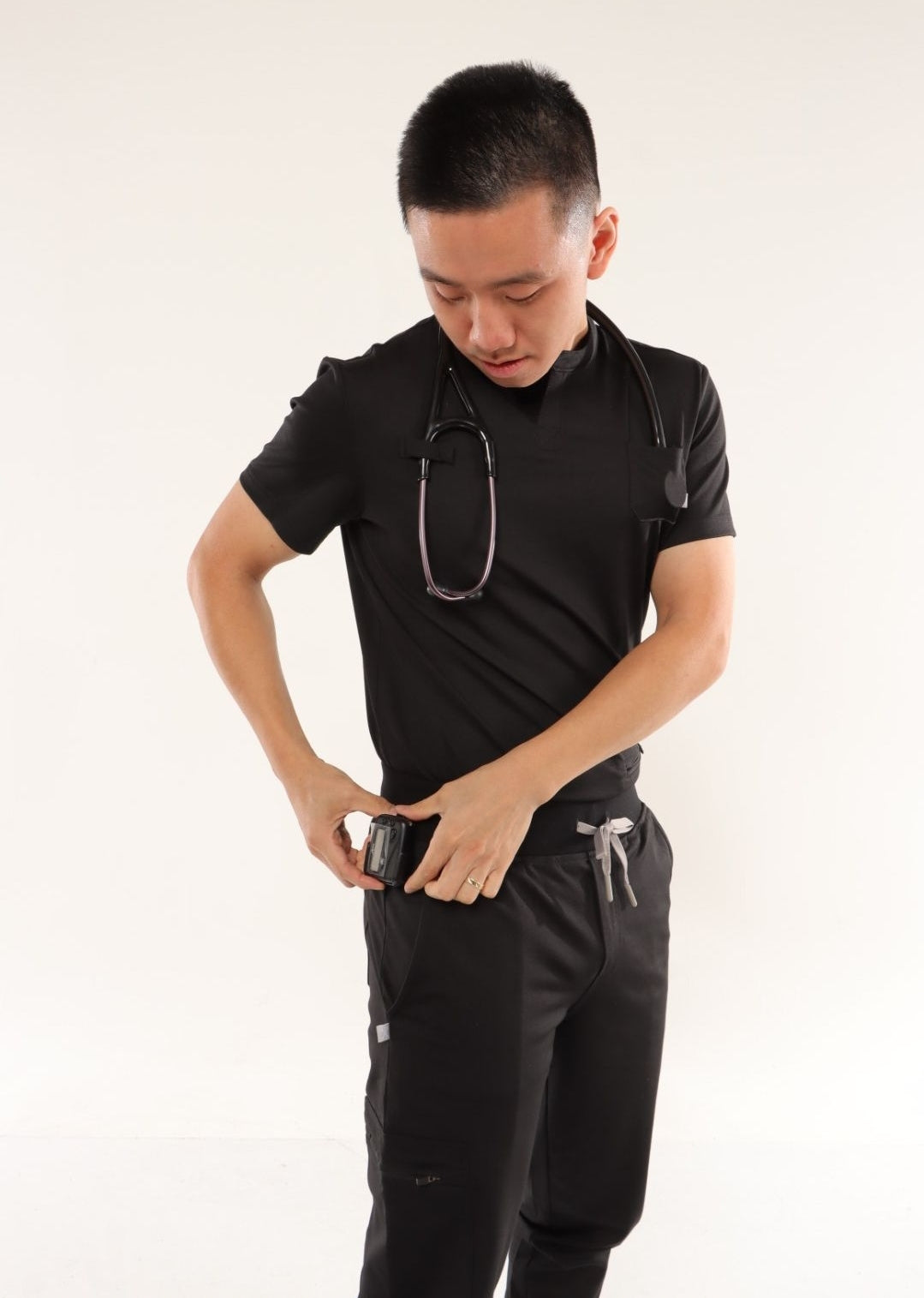 Science + scrubs =exoderm scrubs. The first scrubs to stabilize your stethescope with no extra equipment needed. Offers liquid protection, dual sided pager loops, and super soft, stretchy, skin friendly fabric.